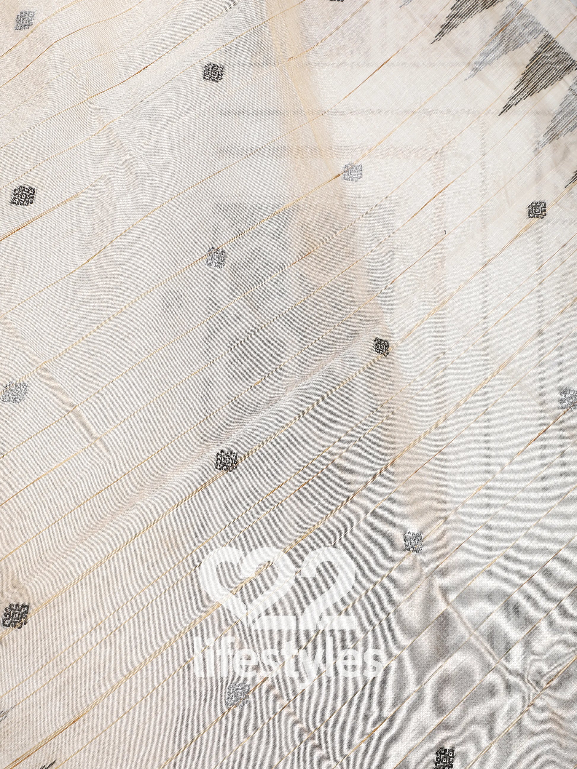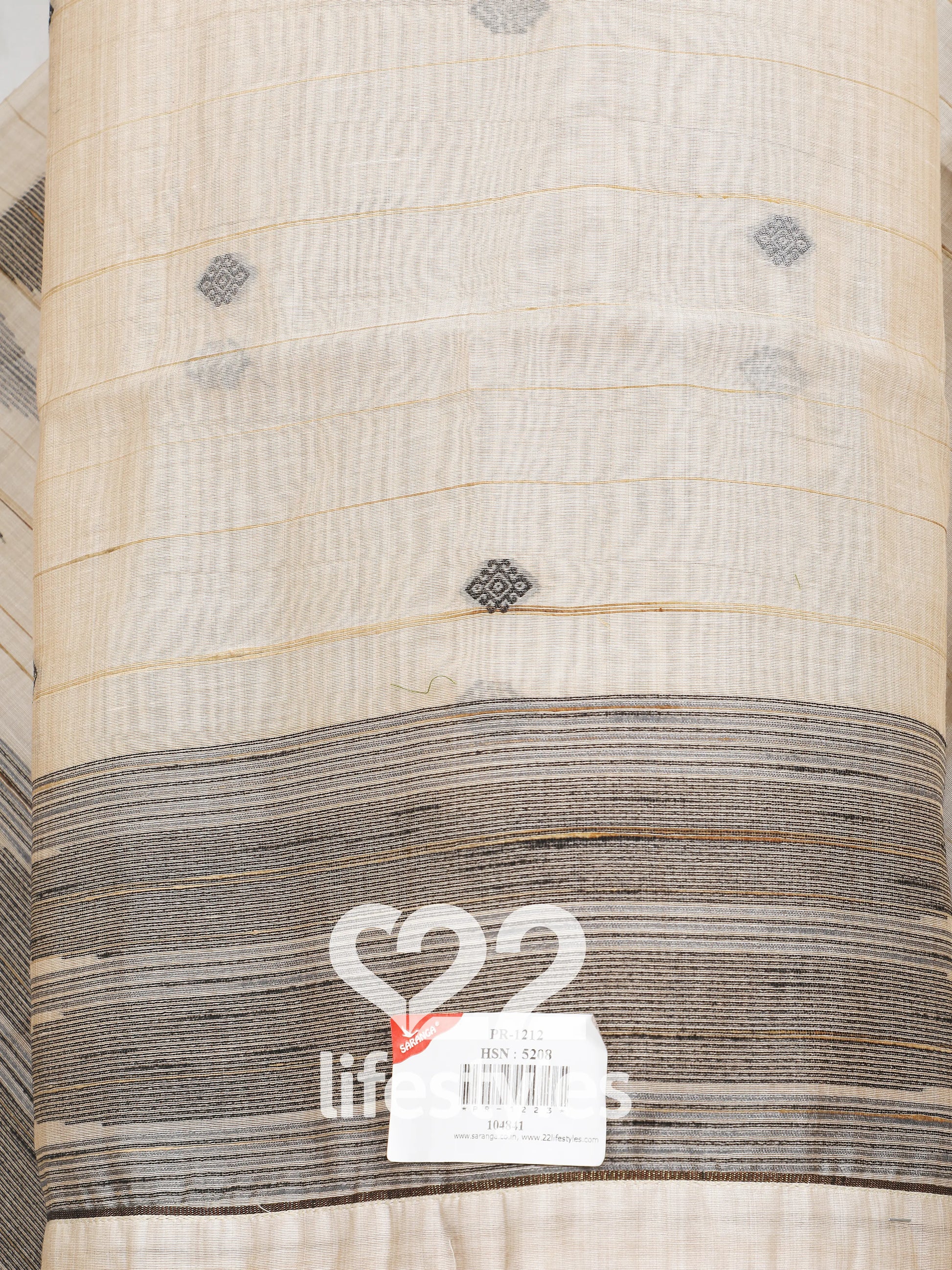 This Jamdani Maheshwari unstitched dress material features a subtle beige and black palette with minimalistic woven motifs and fine striped borders. The set is light, elegant, and perfect for stitched custom ethnic wear and day-to-evening comfort.