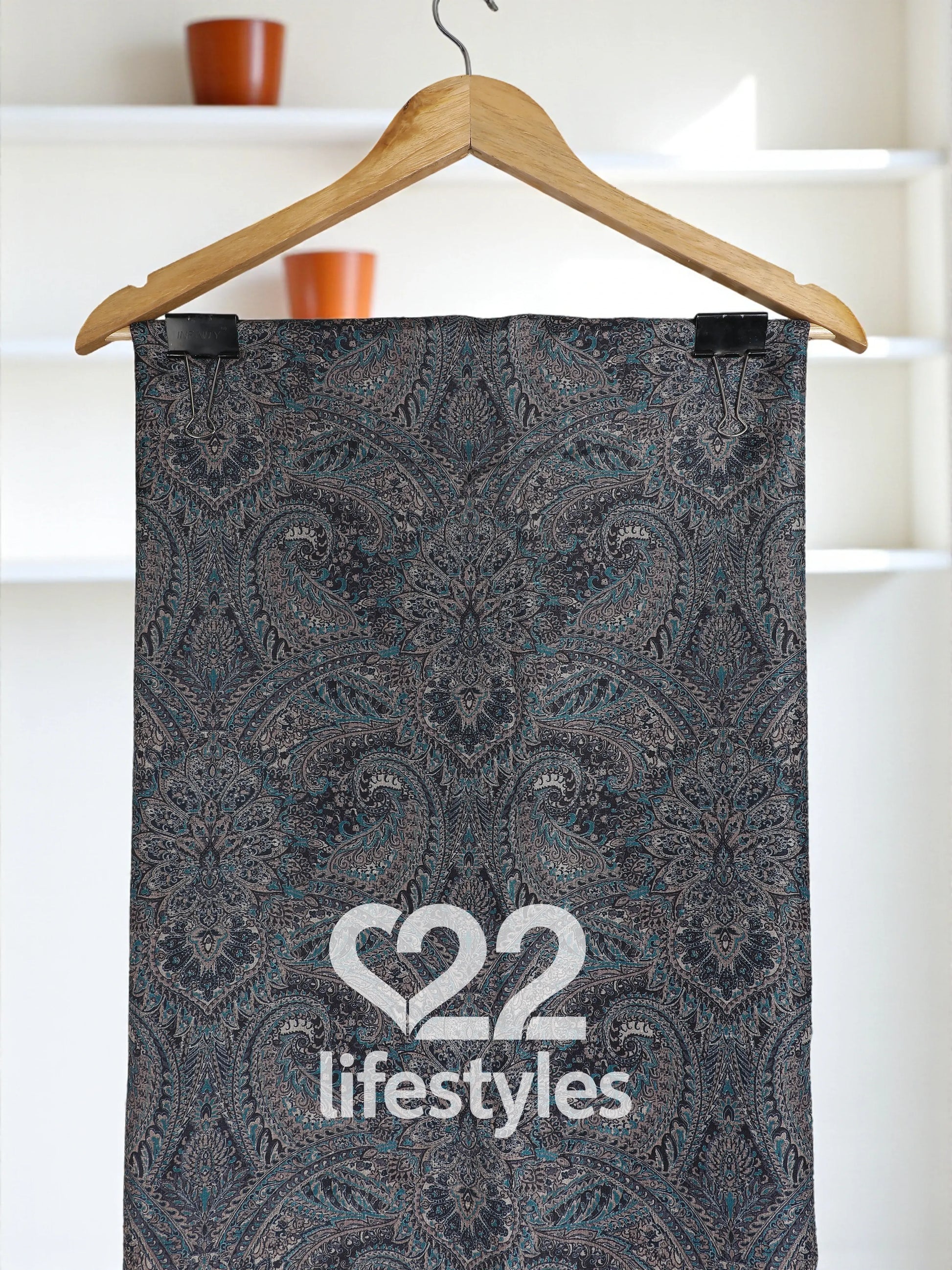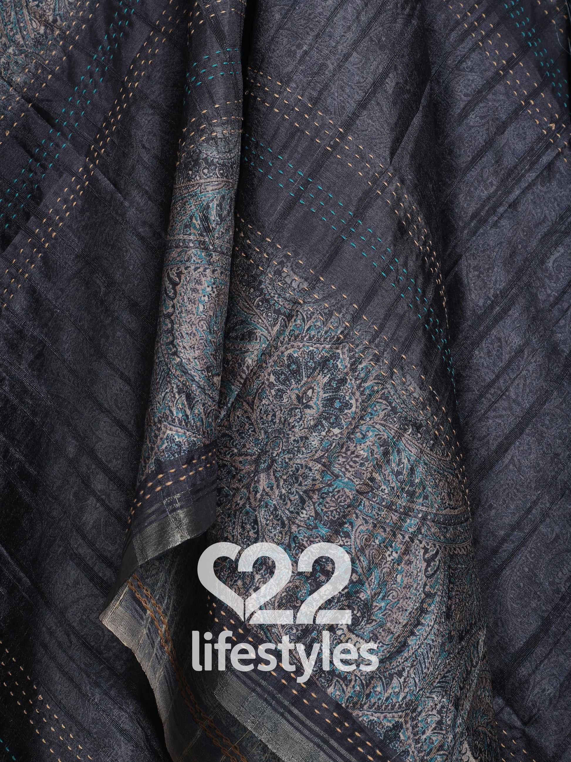 Immerse yourself in luxury and timeless elegance with this Tussar Unstitched Dress Material set. The main fabric features deep midnight blue hues enlivened with traditional paisley motifs and a finely detailed woven border, capturing Tussar silk’s signature texture and natural sheen.