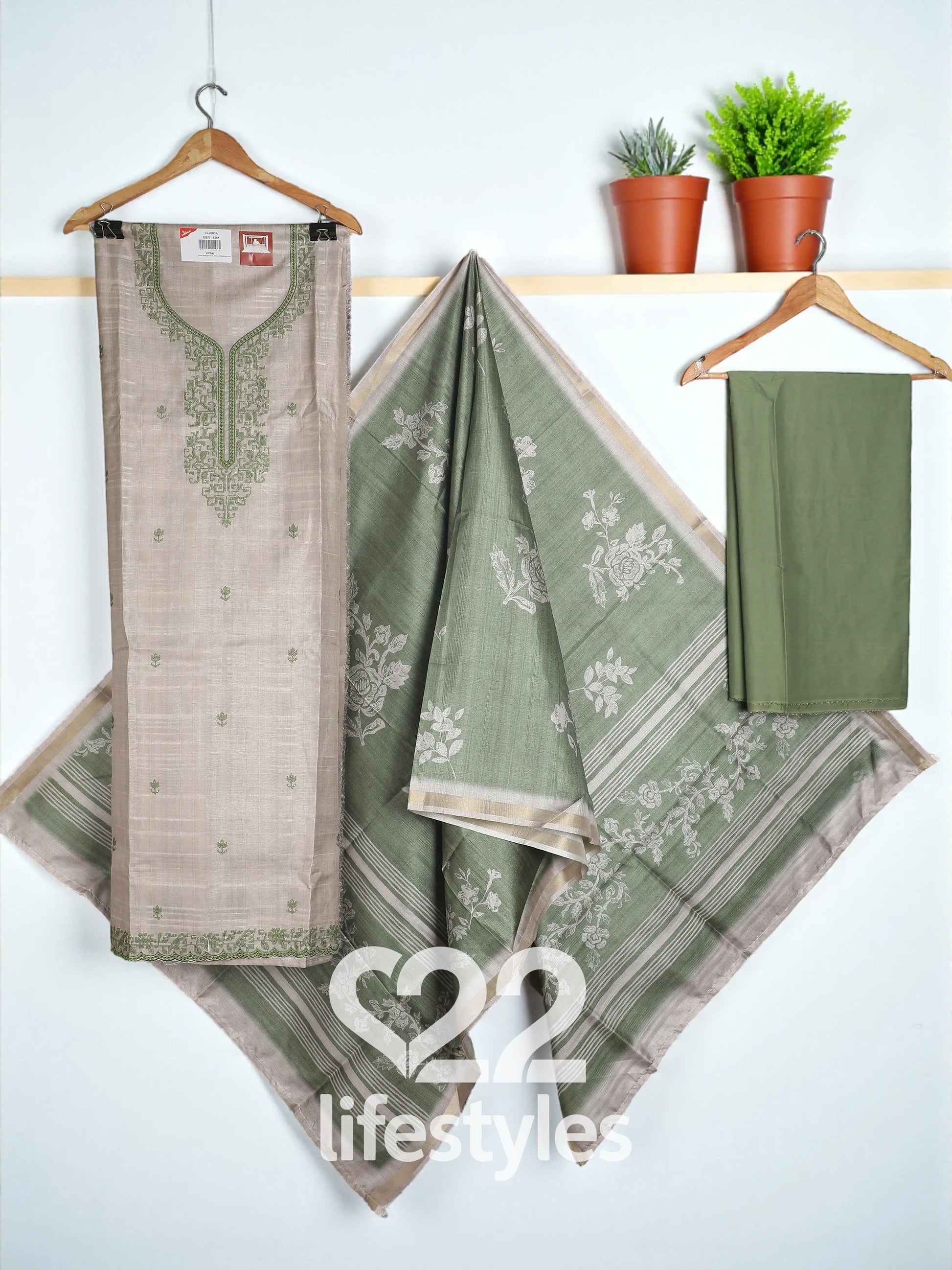 Color: Beige kameez with sage green accent dupatta and matching bottom